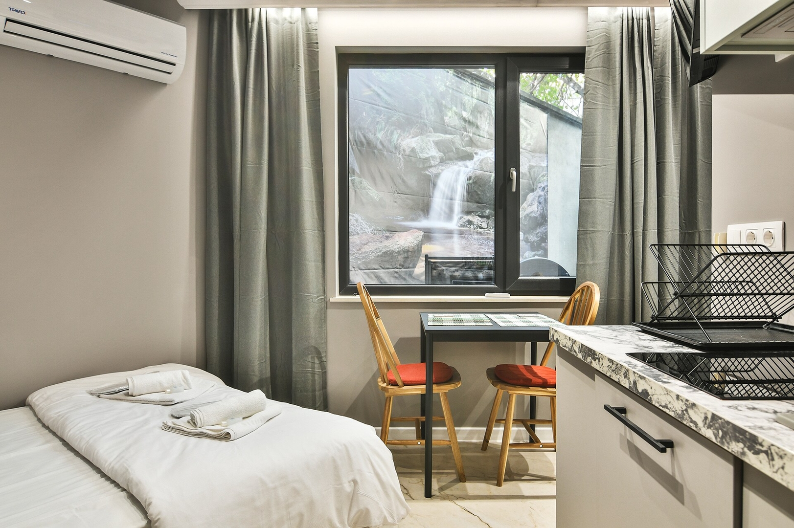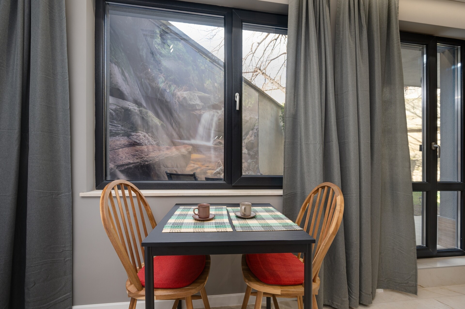 The studio has a modern bathroom with a sleek shower cabin and air conditioning to keep you comfortable during your stay. Step out onto your private patio, complete with a table and chairs, where you can enjoy a morning coffee or unwind after a day of exploring.