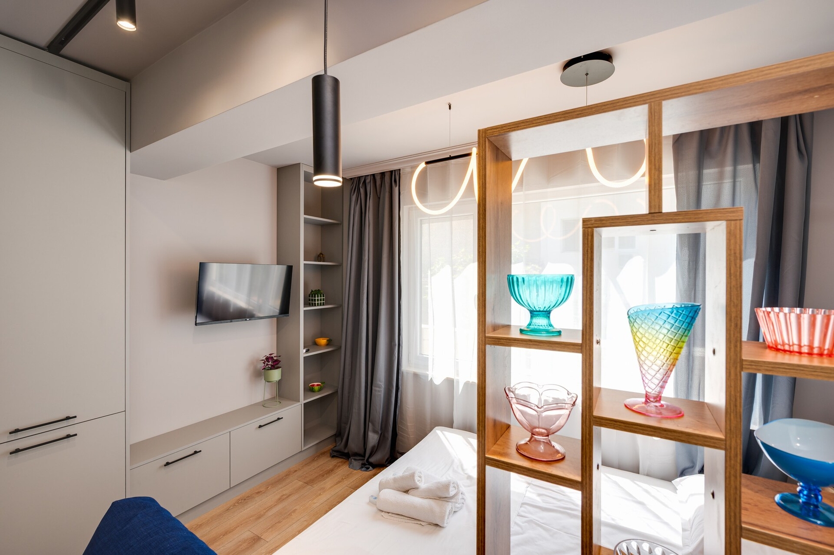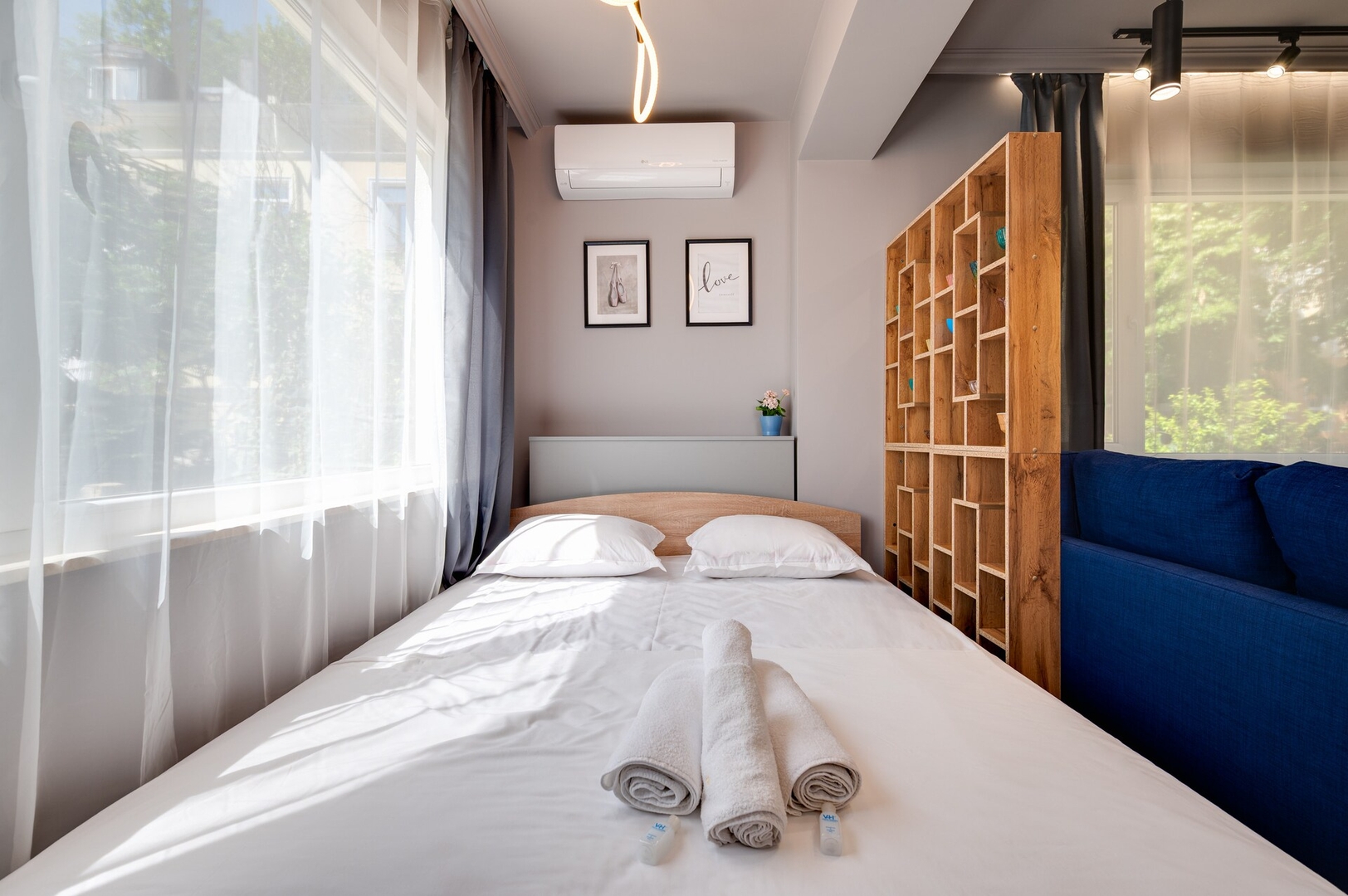 The sleeping area features a king-size bed with soft linens and blackout curtains, separated by a chic shelving unit from the stylish blue sofa bed, which sleeps up to two more.